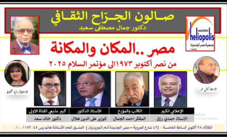 تنطلق بمكتبة مصر الجديدة العامة، في الساعة السادسة من عصر بعد غدٍ الثلاثاء، فعاليات صالون الجراح الثقافي الشهري، والذي يعقد هذا الشهر بعنوان “مصر المكان والمكانة: من نصر أكتوبر 1973 حتى مؤتمر السلام 2025″، وذلك برعاية جمعية مصر الجديدة برئاسة الدكتورة سهام الجوهري، رئيس الجمعية، وصالون الجراح الثقافي برئاسة الدكتور جمال مصطفى سعيد.