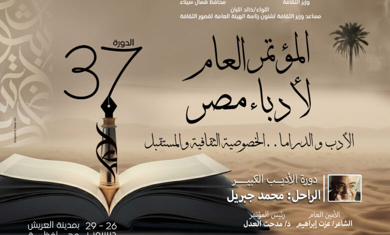 يشهد قصر ثقافة العريش في السابعة والنصف مساء غد الجمعة، انطلاق فعاليات المؤتمر العام لأدباء مصر في دورته السابعة والثلاثين، دورة “الأديب الكبير الراحل محمد جبريل”، والذي يقام هذا العام تحت عنوان “الأدب والدراما.. الخصوصية الثقافية والمستقبل”، وذلك برعاية الدكتور أحمد فؤاد هنو، وزير الثقافة، واللواء دكتور خالد مجاور محافظ شمال سيناء، وتنظمه الهيئة العامة لقصور الثقافة برئاسة اللواء خالد اللبان، وتستمر حتى 29 ديسمبر الجاري، في إطار برامج وزارة الثقافة.