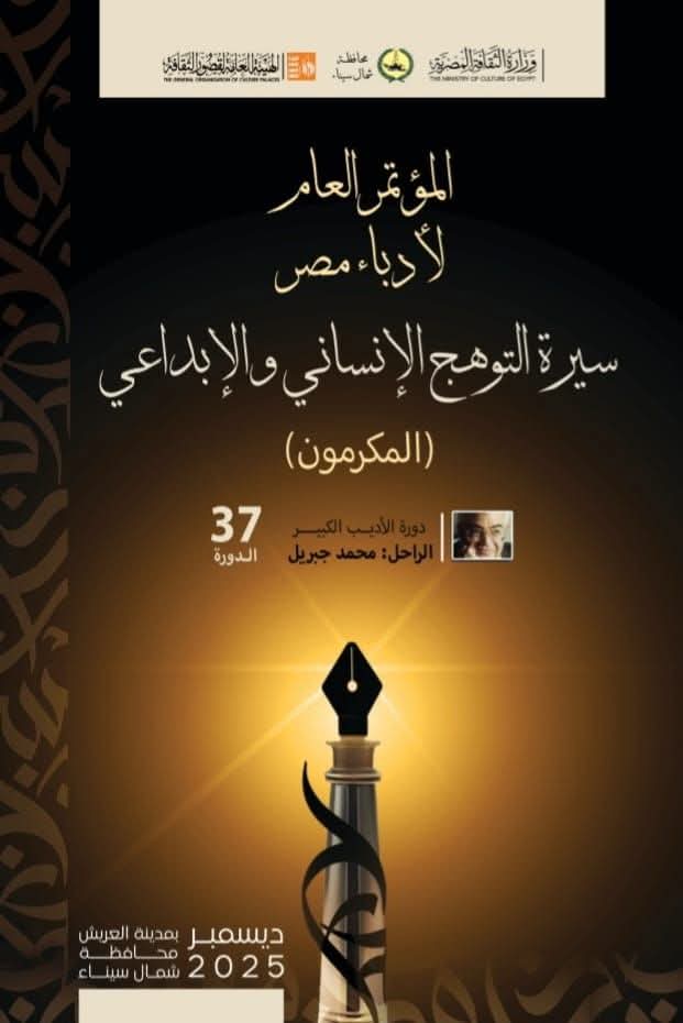 تنطلق فعاليات الدورة السابعة والثلاثين من المؤتمر العام لأدباء مصر خلال الفترة من 26 إلى 29 ديسمبر الجاري بمحافظة شمال سيناء، “دورة الأديب الكبير الراحل محمد جبريل”، تحت رعاية الدكتور أحمد فؤاد هنو وزير الثقافة، واللواء دكتور خالد مجاور محافظ شمال سيناء، وتنظمه الهيئة العامة لقصور الثقافة برئاسة اللواء خالد اللبان.